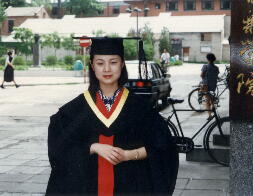 最近「女子十二楽坊」がとても有名になっていますね。中国音楽が日本で知られることは本当に嬉しいです。彼女たちのおかげで、日本の方が中国音楽を、特に中国琵琶を好きになっていただければ幸いです。また、メンバーの殆どは私と同じ大学で、親しい人もいました。とても懐かしいです。学生時代のことをいろいろ思い出しました。昔のアルバムを開いたら、卒業写真が出てきました。(左の写真は卒業式の時のものです) |