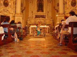 これはイタリアのアンコナーにある教会です。6月14日の夜11時にこの教会でコンサートをしました。もともと蝋燭だけの灯火で開くキャンドル・コンサートという企画でしたが、一曲弾いてみたら、暗くてフレットがまったく見えなかったので、やはり電気をつけて貰いました。アンコナーは海辺の町で、とても綺麗でした。靴が有名だそうですので、翌日の15日は丸一日買い物しようと計画していましたが、15日は日曜日のため、店は全部休みで教会しか開いていなかったです。4つの教会を見学しました。(つづく) |